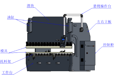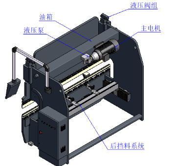電液伺服液壓折彎機主要由床身、控制系統、液壓系統、后擋料系統、模具及補償機構等部分組成,運動方式為上動式(液壓驅動系統在上面,驅動滑塊上下運動,工作臺不動),其結構復雜、精度高,設備安全方面采用了雙重保護。